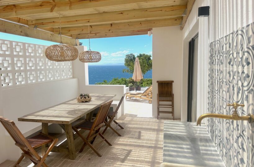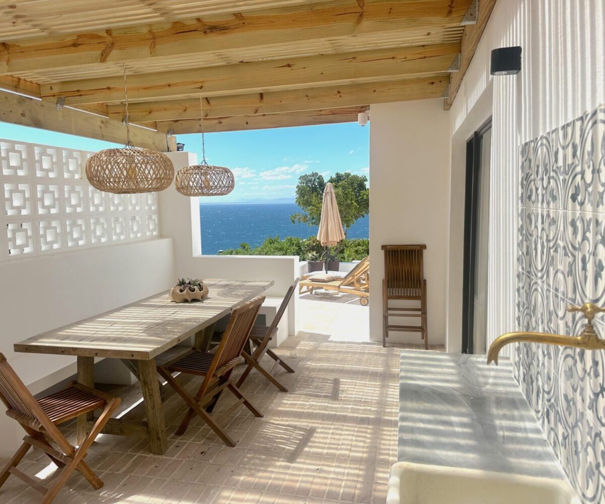 Protected outdoor dining area with a long wooden table for sunset meals